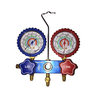 R22 R134A R404A 2 valve manifold with sight glass, 1/4″ SAE fittings inc centre T, 68mm gauges R134A, KPa, psi Fahrenheit, Celcius. Replacement gauges 452-CB (Blue), 452-CR (Red).